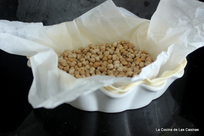 Cubre tu molde que has untado con mantequilla y espolvoreado de harina con la plancha de hojaldre, pincha con un tenedor, cubre con papel vegetal y coloca los garbanzos para que no se suba demasiado. Introduce en horno precalentado a 180º durante 15-20 minutos o hasta que esté doradito. Los últimos 5 retiras garbanzos y papel. No los tires, te servirán para otras preparaciones.